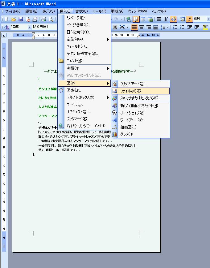 「挿入」→「図」→「ファイルから」とクリックしていきます(Word2000~2003)