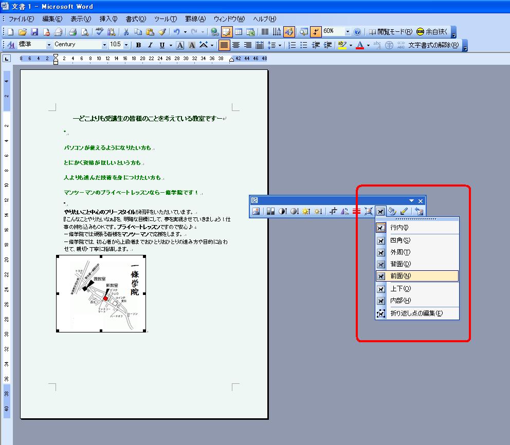 表示された 図ツールバーの「文字列の折り返し」(犬のマーク)