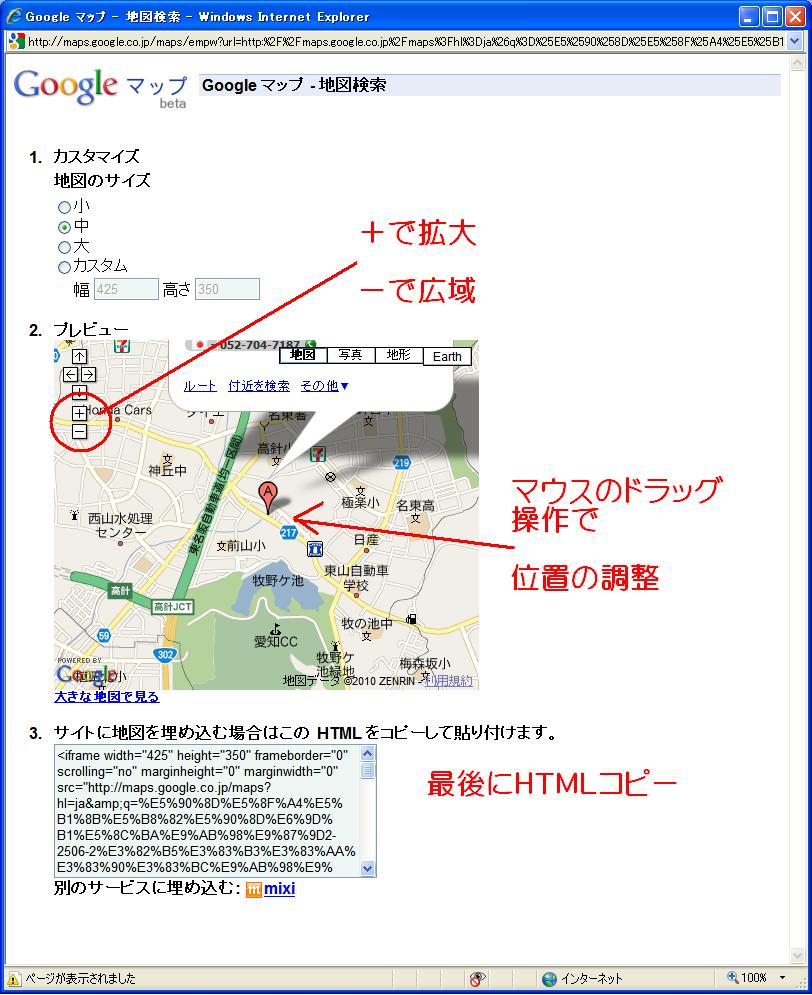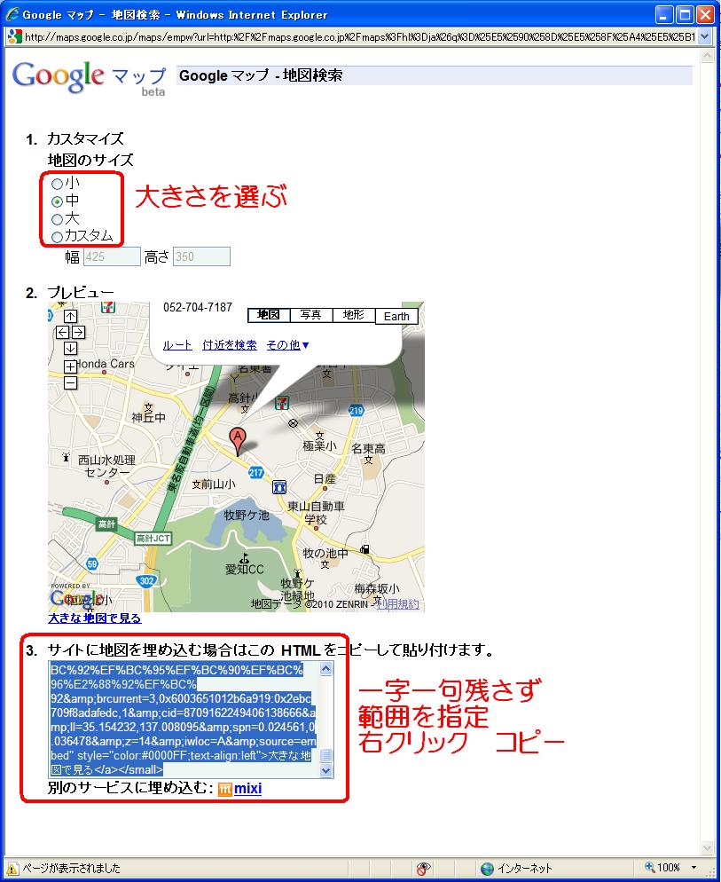 「サイトに地図を埋め込む場合はこのHTML をコピーして貼り付けます。」